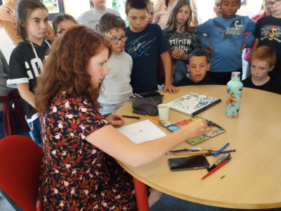 A l’occasion du festival Bulle des Prés, organisé par la médiathèque de la Guerche-de-Bretagne, nos quatre classes de sixième ont pu rencontrer à tour de rôle, dans la salle d’exposition de la Salorge, Anne Montel, illustratrice.