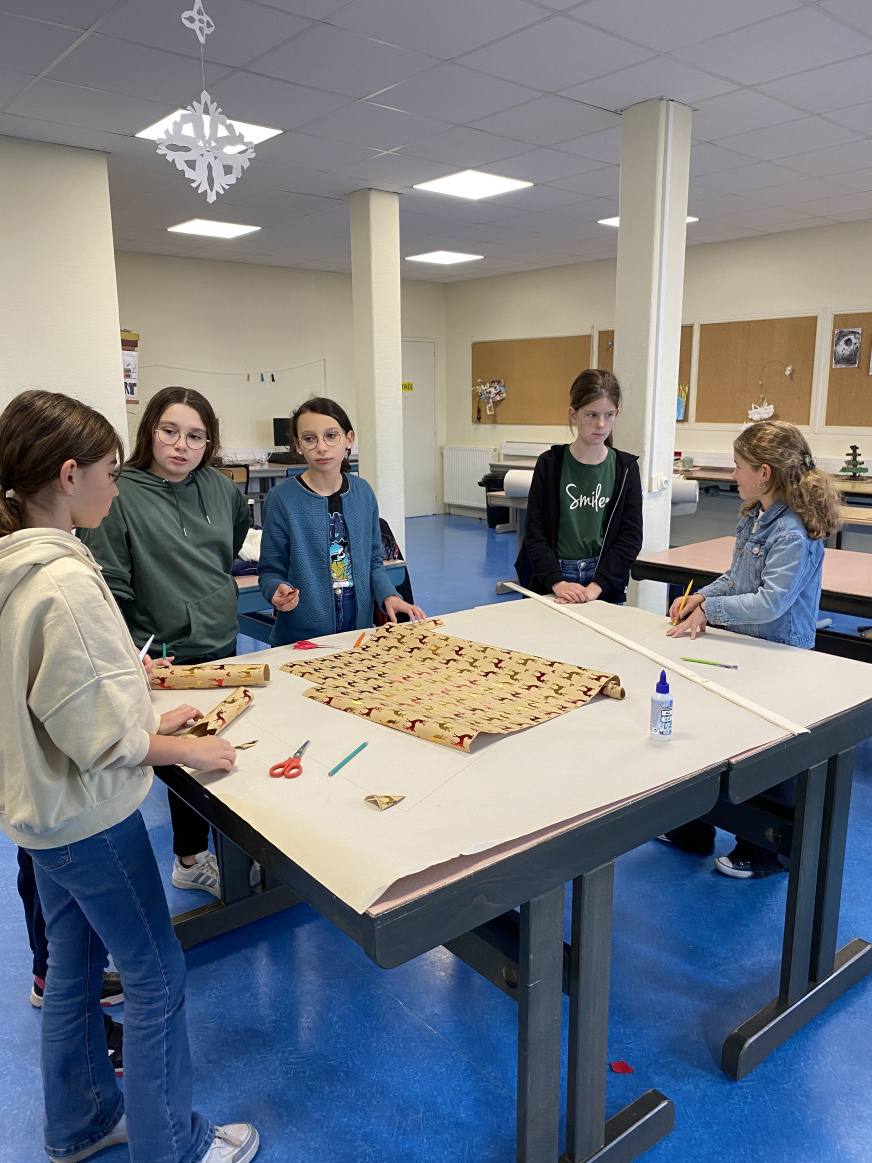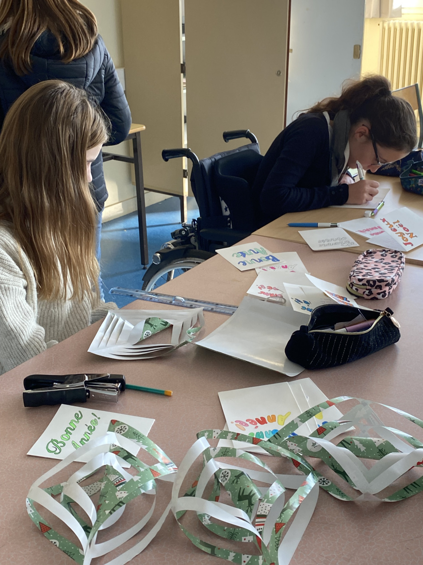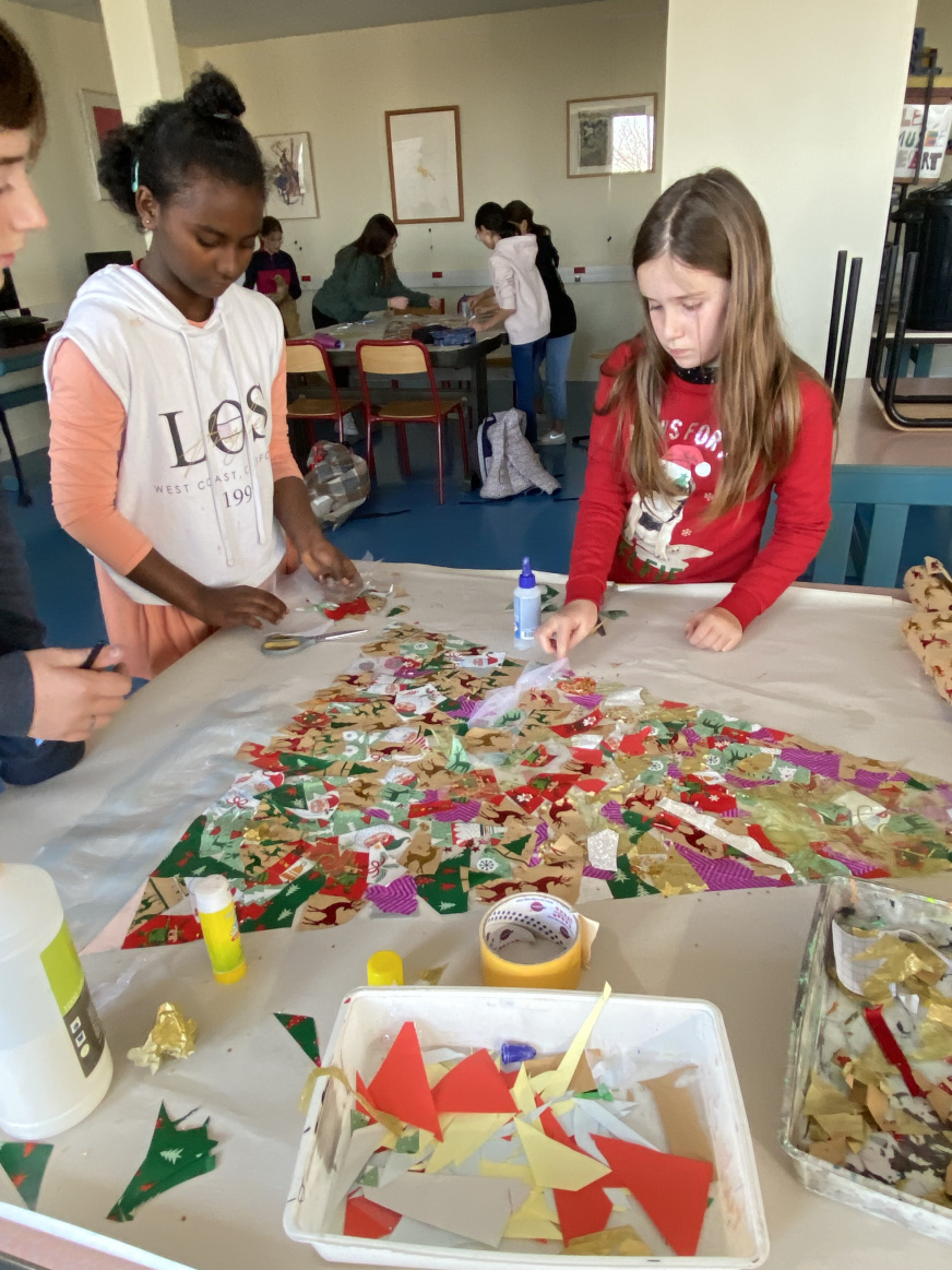 Étoiles colorées à suspendre, sapins de Noël graphiques, guirlandes, photophores de tables, cartes de vœux , chacun s’active pour le plaisir de tous… Chaque jour des élèves de la 6 e à la 3e œuvrent ensemble dans une ambiance détendue et studieuse.