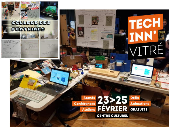 Cette année, le collège des Fontaines a été invité par l’équipe de Makeme à présenter les travaux du cours de technologie et du club de robotique au salon Tech Inn’Vitré. Pendant deux jours, le professeur de technologie aidé de deux anciens élèves a pu démontrer l’esprit créatif et débrouillard des élèves du collège.