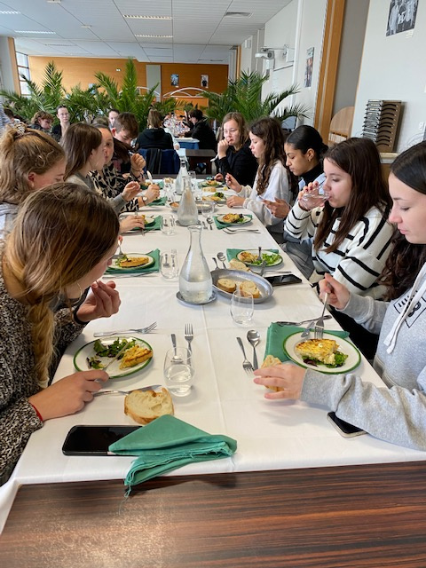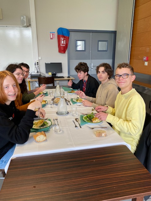 Après ce détour historique et une belle promenade sous un ciel grisonnant, les élèves ont été reçus par nos hôtes du lycée Hôtelier Yvon Bourge. Ils ont pu déjeuner au restaurant d’initiation, servis par des élèves à peine plus âgés qu’eux, qui mettaient en pratique leurs formations en service hôtelier.