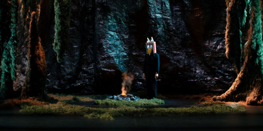 Accessoire de rituel et de métamorphose, le masque investit celui qui le porte de pouvoirs surnaturels. C’est ici que l’histoire commence avec la découverte d’un masque en carton aux couleurs vives, mi-humain, mi-animal avec son bec et ses grandes oreilles. Coiffé de cet attribut, Étienne Saglio s’engage dans un périple magique, truffé d’illusions, de faux-semblants et de spectaculaires jeux d’échelles. Son personnage tente de sortir de son corps, se démultiplie ou se transforme en oiseau pour voler sous nos yeux ébahis. À l’intérieur d’une caverne mystérieuse, il entame une danse rituelle avec son ombre à la lueur des flammes. Baignés dans des atmosphères musicales entêtantes, les tableaux se succèdent. Étienne Saglio excelle dans l’art de créer des images qui subjuguent. Au détour de ses rencontres avec son alter ego miniature, un chien complice et un géant de quatre mètres, le magicien nous interroge sur notre relation aux autres, notre envie de se transformer et de devenir un autre. Une excursion dans une folle rêverie où tout concourt à repousser les limites du réel.