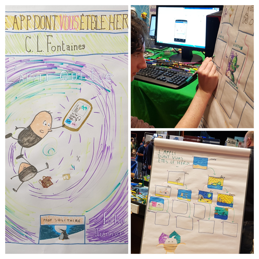 Succès encore plus grand pour l’atelier de programmation des applis sur Androïd bien connu de nos élèves en 3e. Sur le principe des vieux Livres Dont Vous Êtes Le Héros, les visiteurs de Tech’Inn Vitré, dont plusieurs anciens élèves, ont écrit, illustré et programmé un jeu sur Androïd. Comme pour une cadavre exquis, les participants proposaient un paragraphe de l’aventure avec deux issues possibles. Aux autres participants d’imaginer la suite.